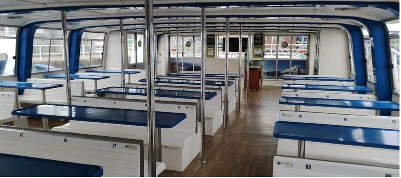 La cubierta superior, al aire libre, brinda espectaculares vistas panorámicas y la posibilidad de sentir la brisa marina durante la travesía. Su diseño incluye un pasillo central que facilita el movimiento a bordo, y la embarcación está equipada con aseos y una barra de servicio para mayor comodidad durante la experiencia.