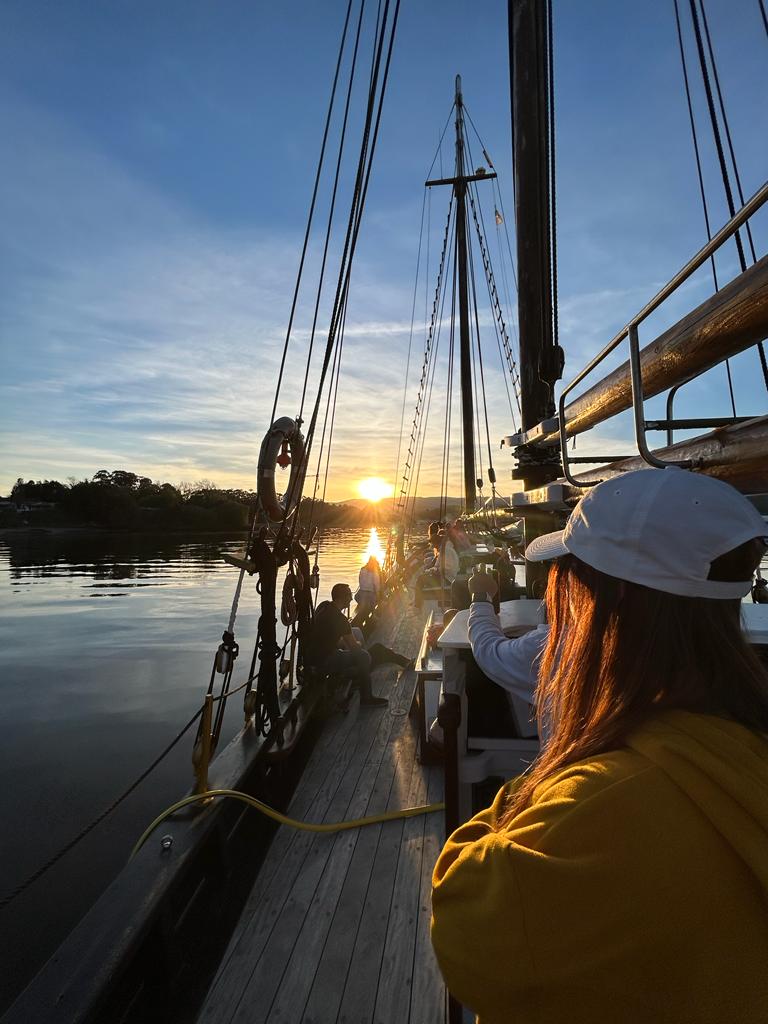 La travesía zarpa desde el Puerto de Vigo, donde serás recibido con calidez por la tripulación. Tras una breve explicación sobre el recorrido, las velas se izarán y la goleta se abrirá paso mar adentro durante unos 30 minutos, dejando atrás la costa mientras las aguas profundas se convierten en el santuario eterno.